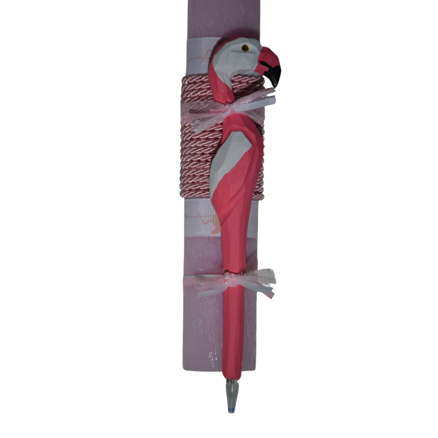 Χρησιμοποιείται αρωματικό κερί, 30 εκατοστών, πάνω στο οποίο είναι δεμένο σκαλιστό στυλό, με τη μορφή πελεκάνου ροζ.